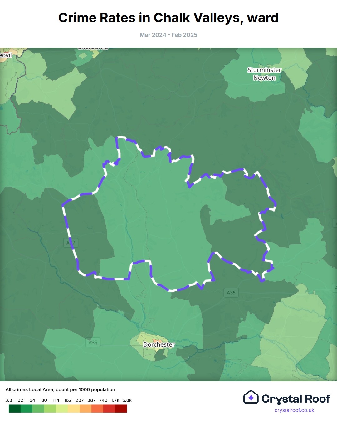 Chalk Valleys (ward) is located within Dorset (borough). Annual total crime rate in Dorset (borough) is 57.2 crimes per thousand resident population, which can be rated as 1 out of 10 or low crime level compared to other local authority districts in England and Wales.