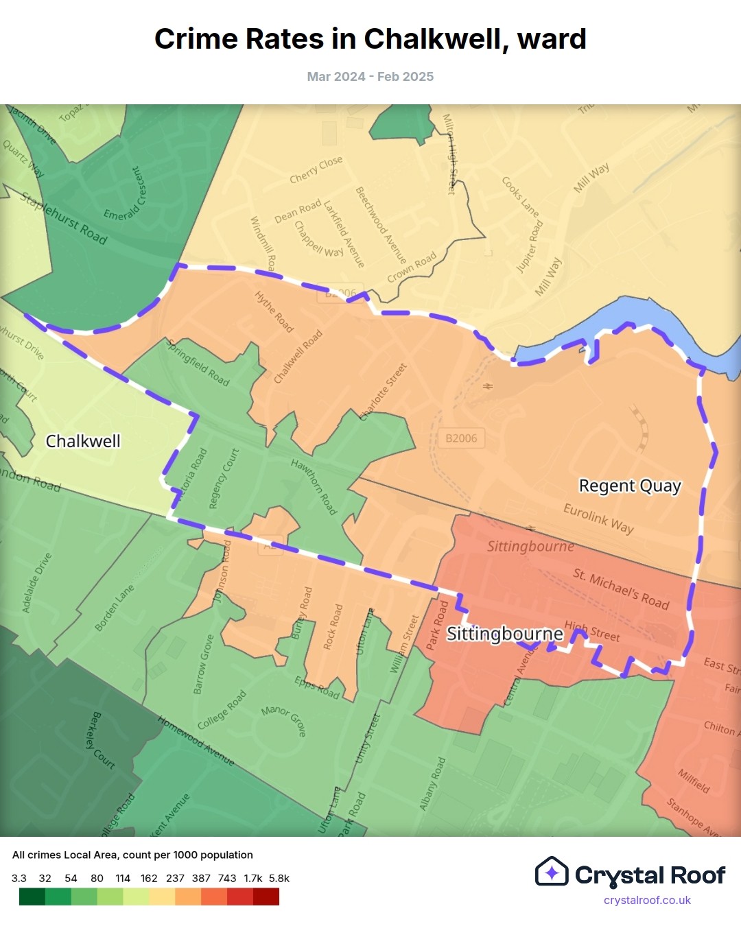 Chalkwell (ward) is located within Swale (borough). Annual total crime rate in Swale (borough) is 107 crimes per thousand resident population, which can be rated as 5 out of 10 or medium crime level compared to other local authority districts in England and Wales.