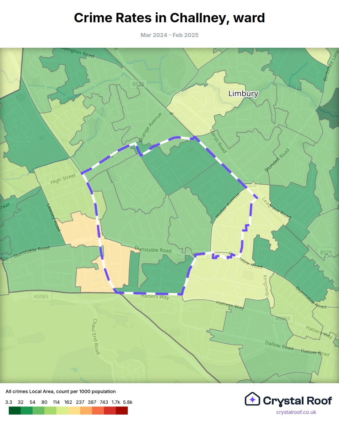 Challney, (ward) includes areas with the following crime ratings (see map):