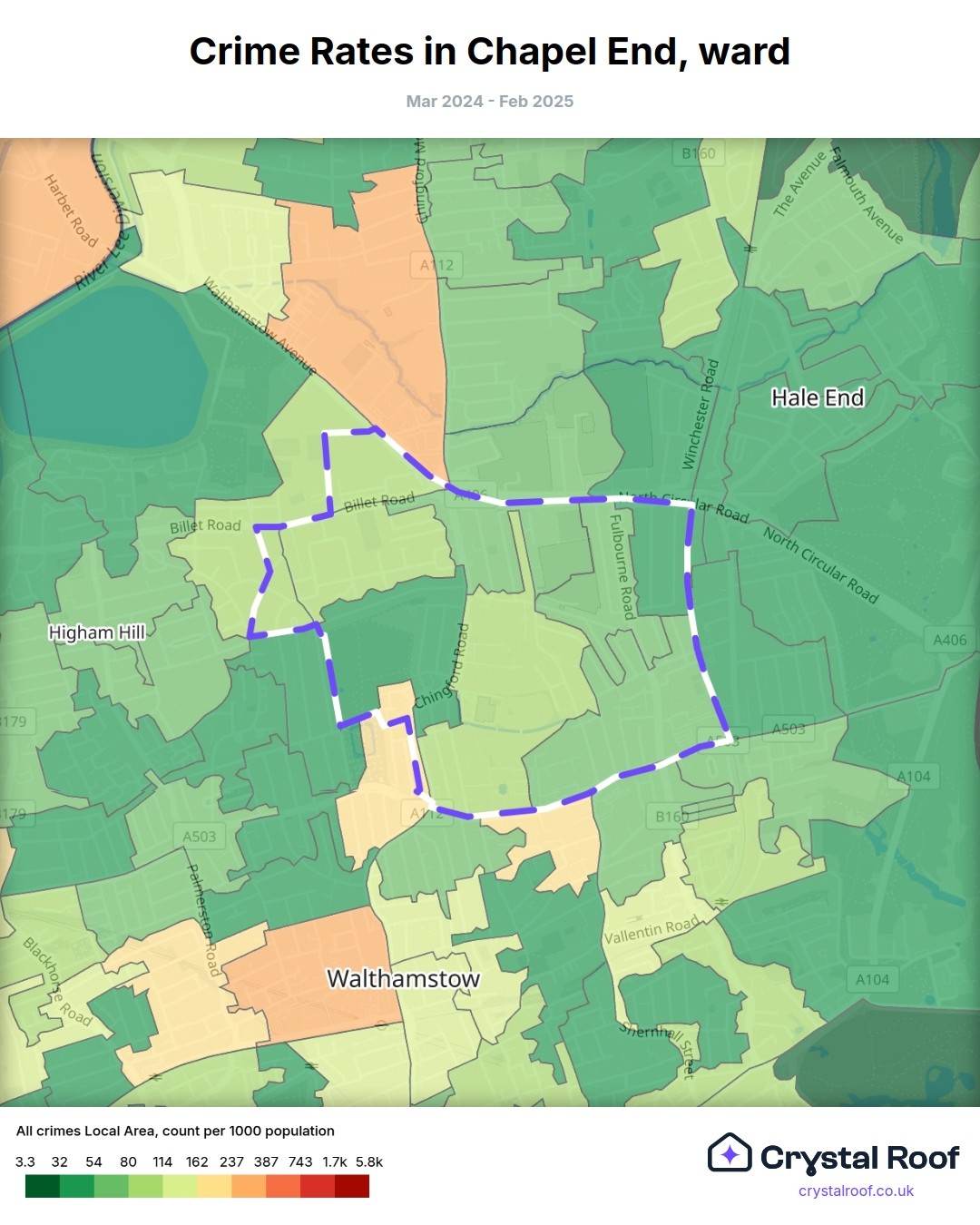 Chapel End (ward) is located within Waltham Forest (borough). Annual total crime rate in Waltham Forest (borough) is 110 crimes per thousand resident population, which can be rated as 5 out of 10 or medium crime level compared to other local authority districts in England and Wales.