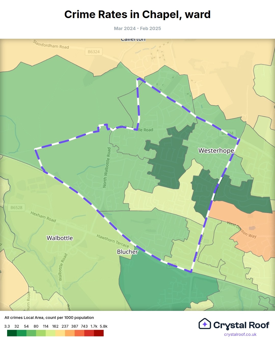 The figures in grey indicate the relative ratings of Chapel (ward) for a specific crime type compared to other wards in England and Wales.