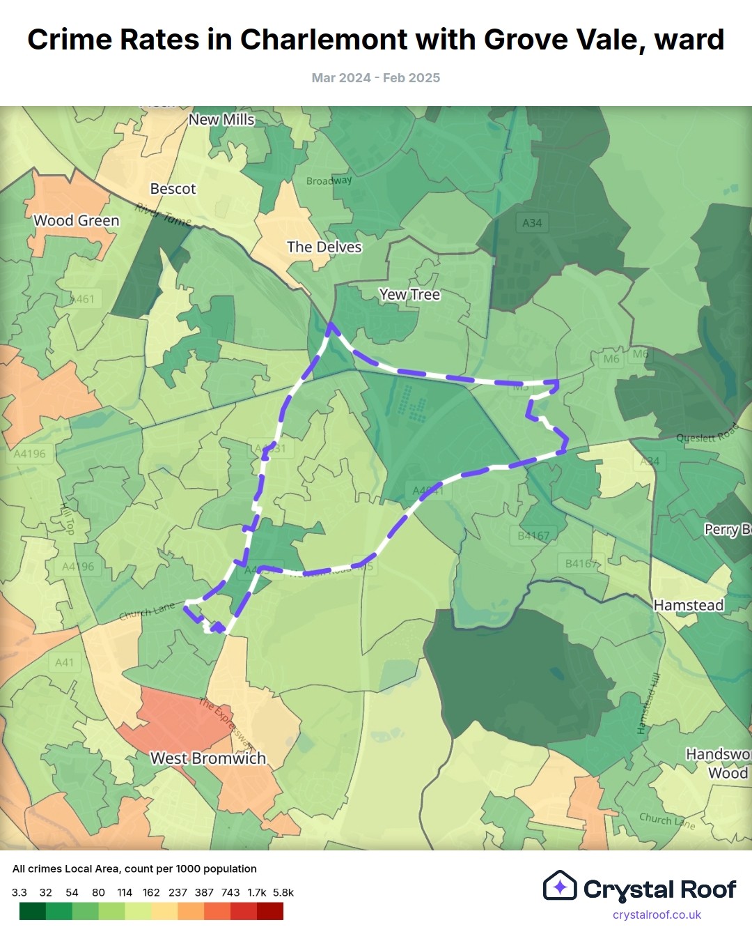 Charlemont with Grove Vale, (ward) includes areas with the following crime ratings (see map):