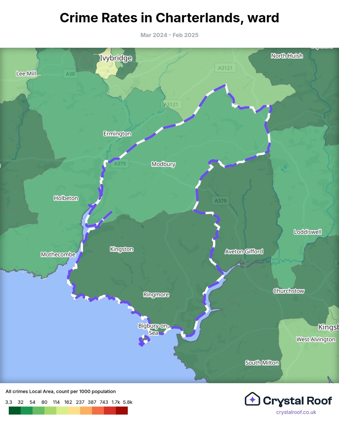 Charterlands (ward) is located within South Hams (borough). Annual total crime rate in South Hams (borough) is 48.4 crimes per thousand resident population, which can be rated as 1 out of 10 or low crime level compared to other local authority districts in England and Wales.