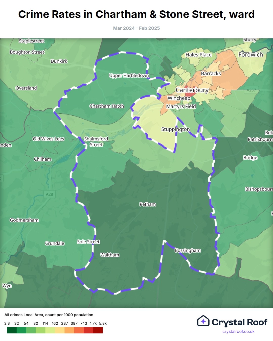 Chartham & Stone Street, (ward) includes areas with the following crime ratings (see map):