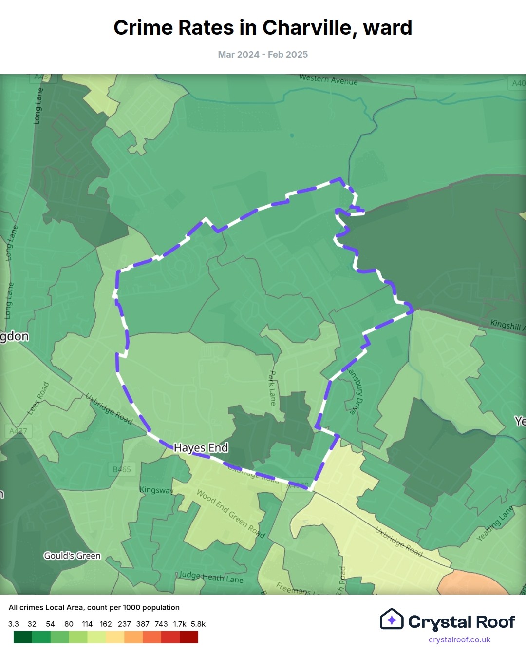 Charville (ward) is located within Hillingdon (borough). Annual total crime rate in Hillingdon (borough) is 129 crimes per thousand resident population, which can be rated as 6 out of 10 or medium crime level compared to other local authority districts in England and Wales.