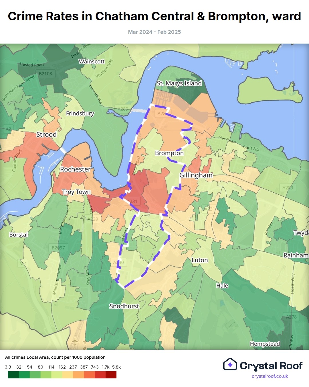 Chatham Central & Brompton, (ward) includes areas with the following crime ratings (see map):