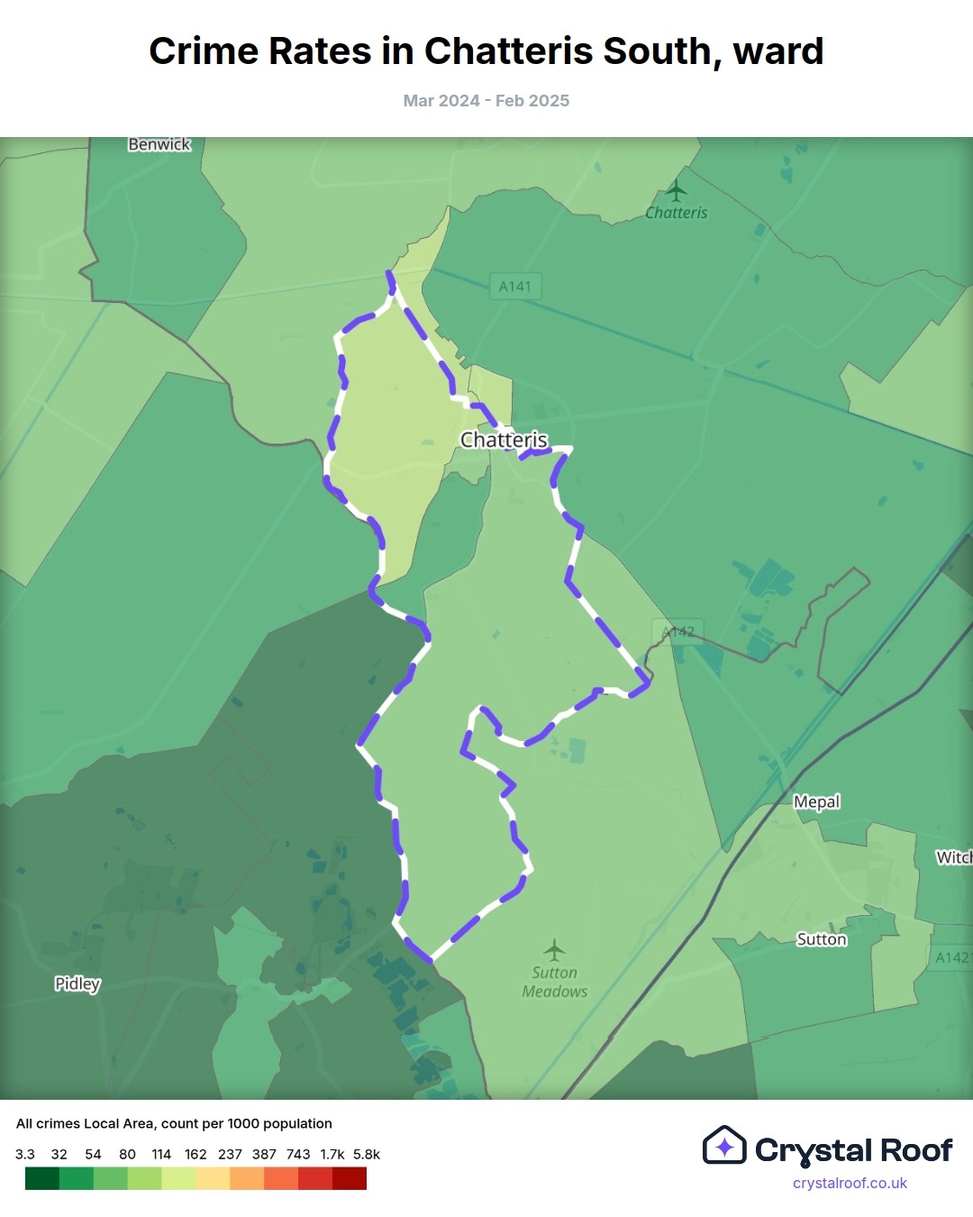 The figures in grey indicate the relative ratings of Chatteris South (ward) for a specific crime type compared to other wards in England and Wales.