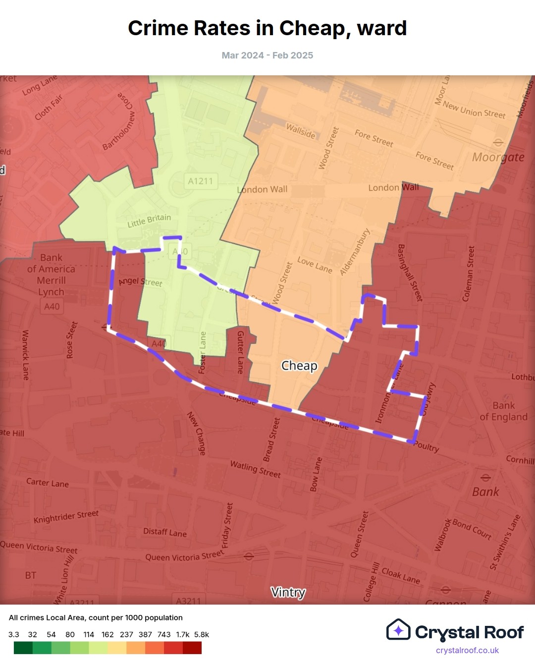 Cheap (ward) is located within City of London (borough). Annual total crime rate in City of London (borough) is 872 crimes per thousand resident population, which can be rated as 10 out of 10 or high crime level compared to other local authority districts in England and Wales.