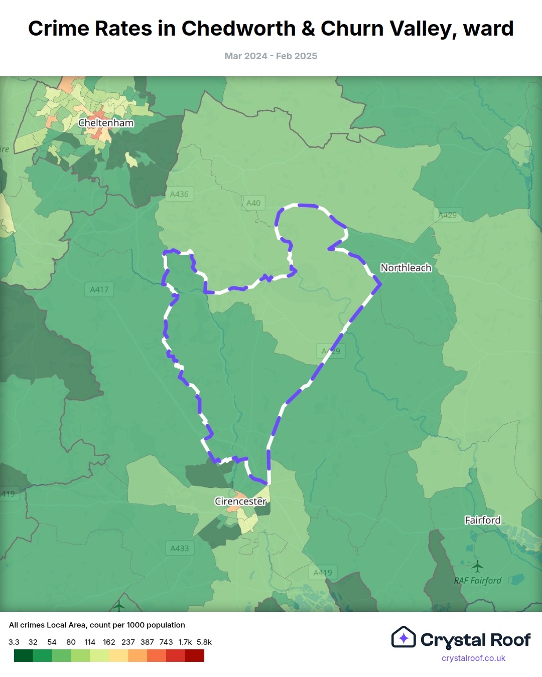 Chedworth & Churn Valley, (ward) includes areas with the following crime ratings (see map):