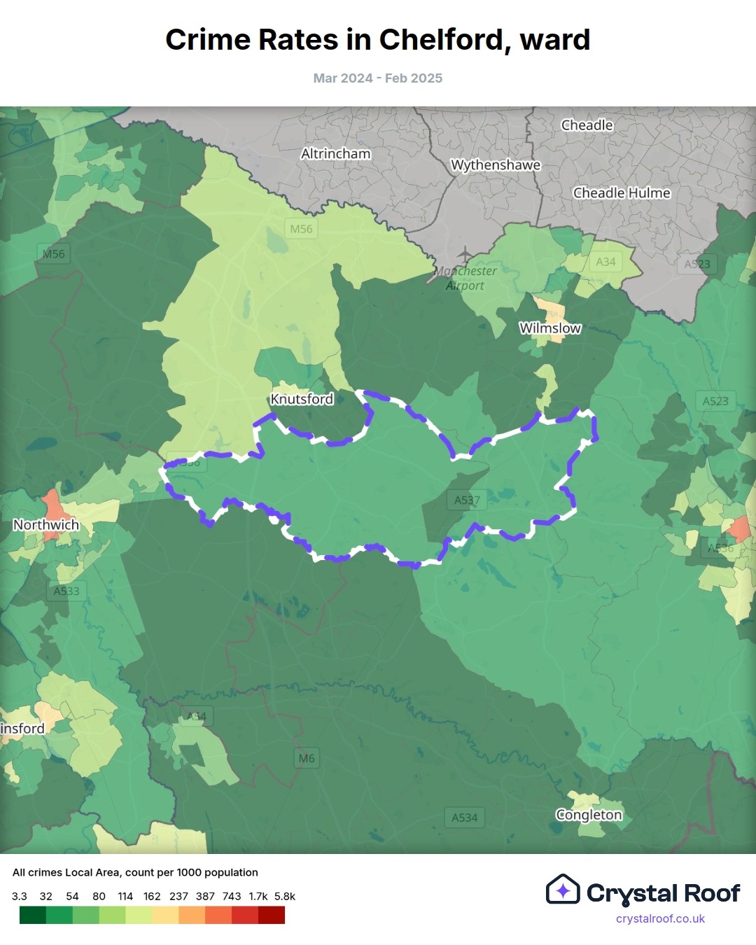 Chelford, (ward) includes areas with the following crime ratings (see map):