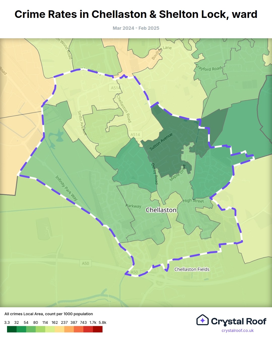 Chellaston & Shelton Lock, (ward) includes areas with the following crime ratings (see map):