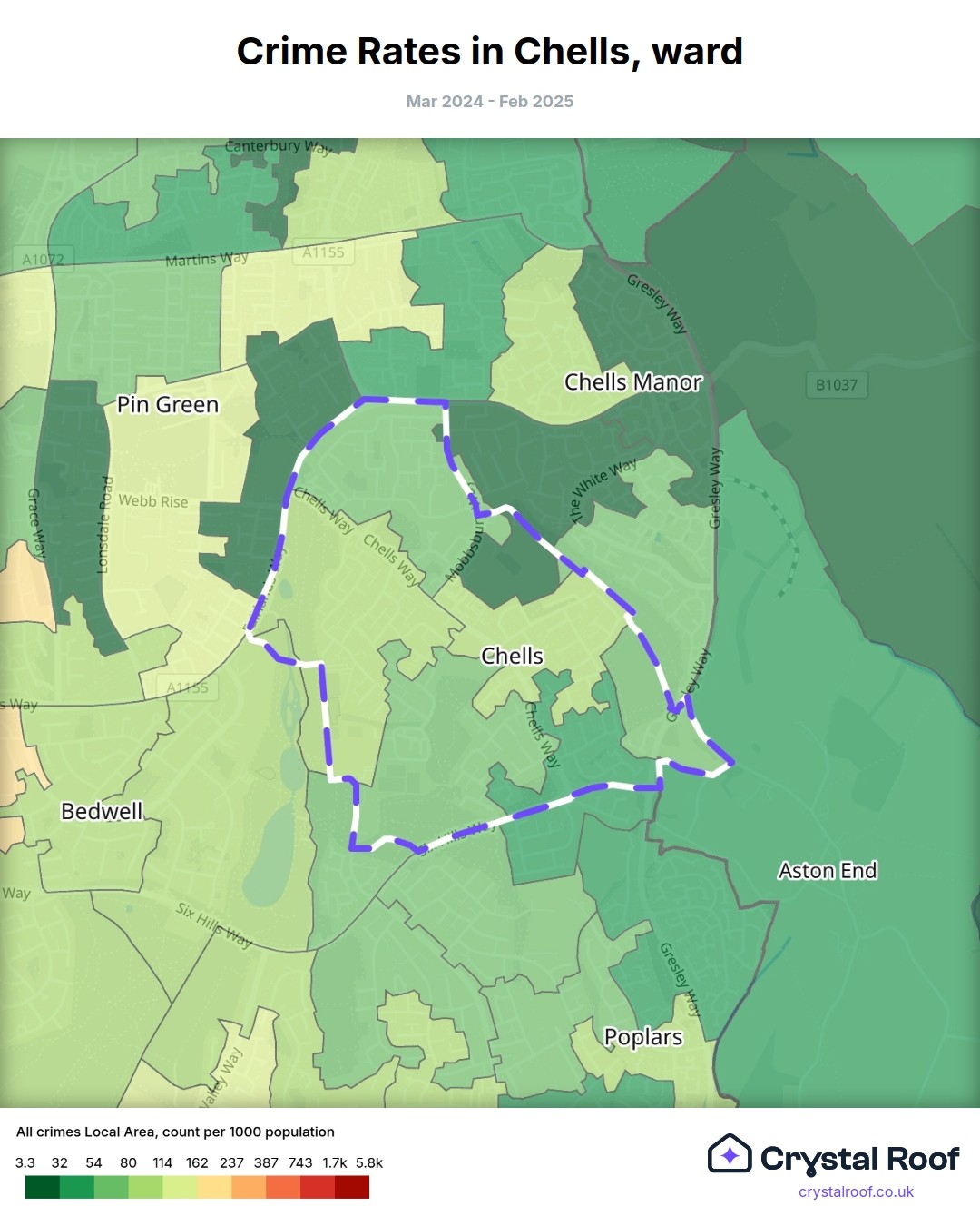 Chells, (ward) includes areas with the following crime ratings (see map):