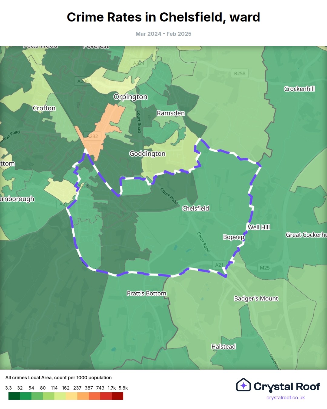 Chelsfield, (ward) includes areas with the following crime ratings (see map):