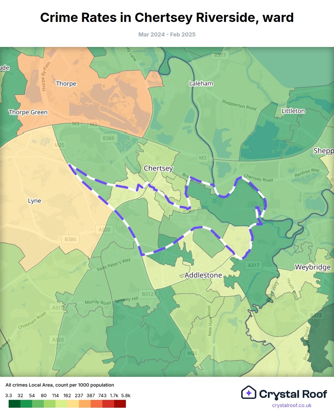 Chertsey Riverside, (ward) includes areas with the following crime ratings (see map):