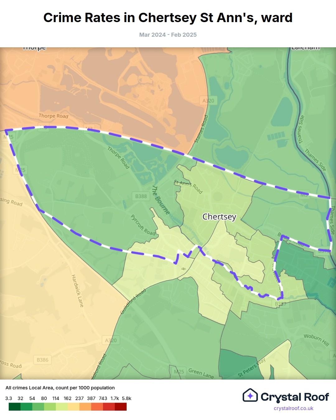 Chertsey St Ann's, (ward) includes areas with the following crime ratings (see map):