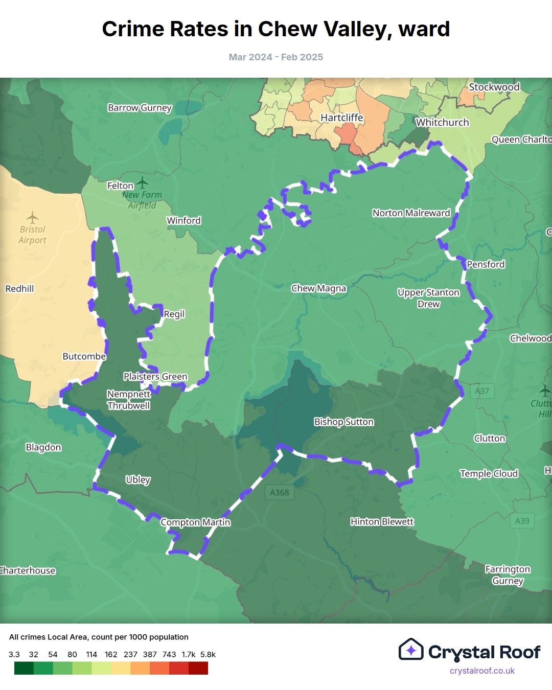 Chew Valley, (ward) includes areas with the following crime ratings (see map):