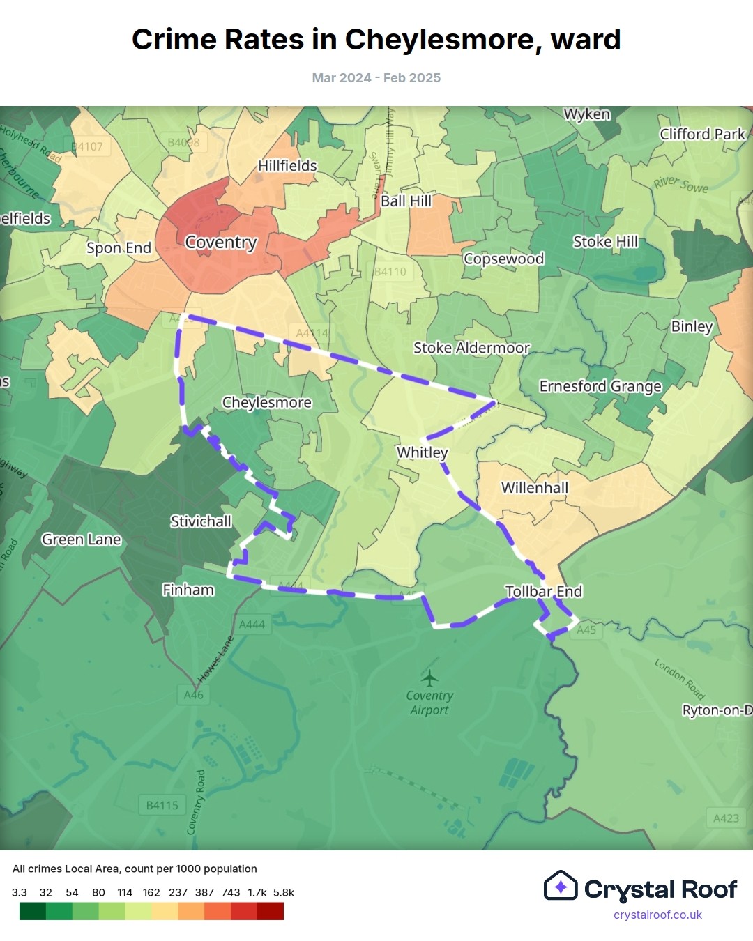 The figures in grey indicate the relative ratings of Cheylesmore (ward) for a specific crime type compared to other wards in England and Wales.