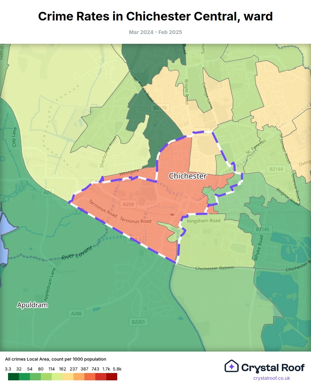 The figures in grey indicate the relative ratings of Chichester Central (ward) for a specific crime type compared to other wards in England and Wales.