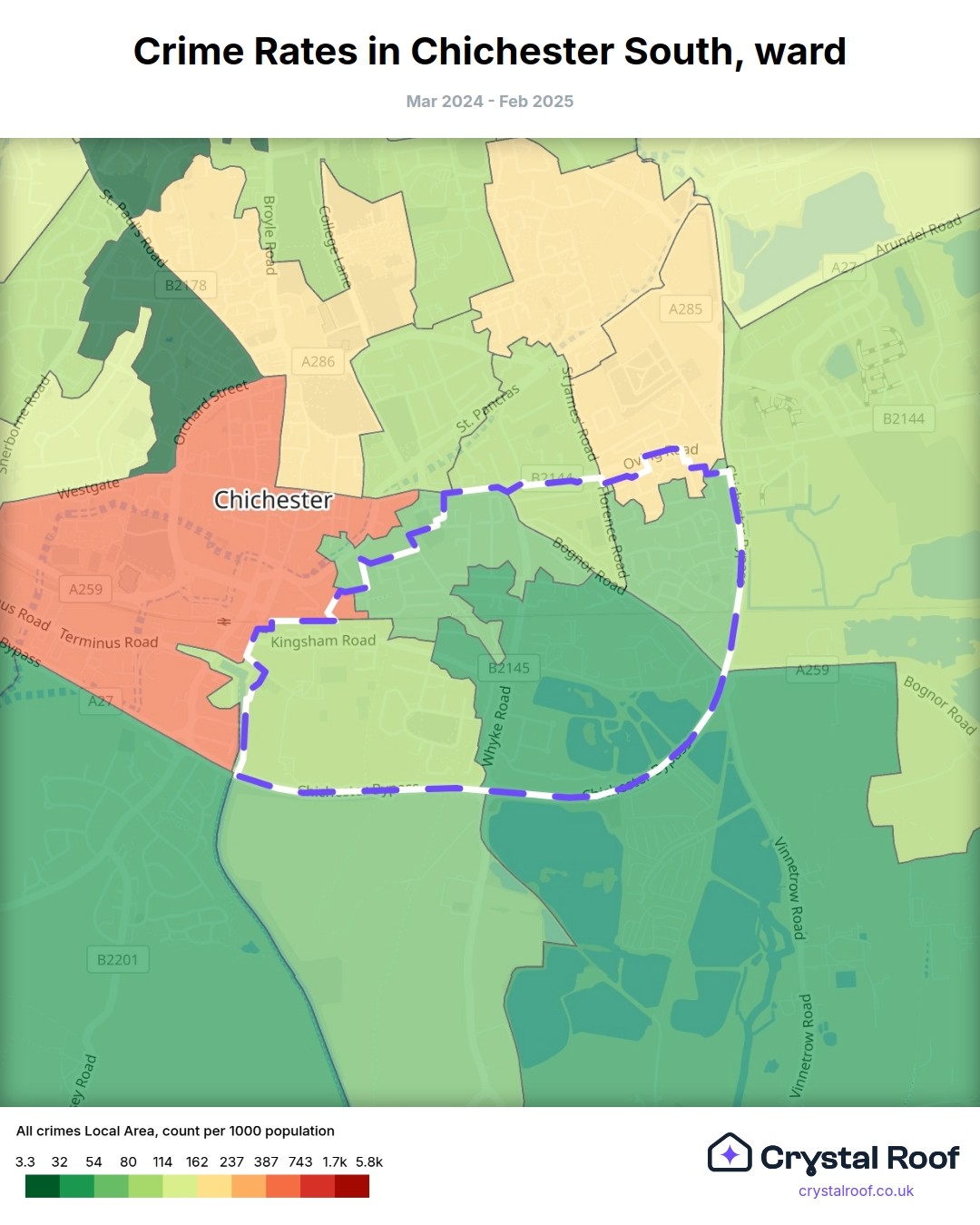 Chichester South, (ward) includes areas with the following crime ratings (see map):