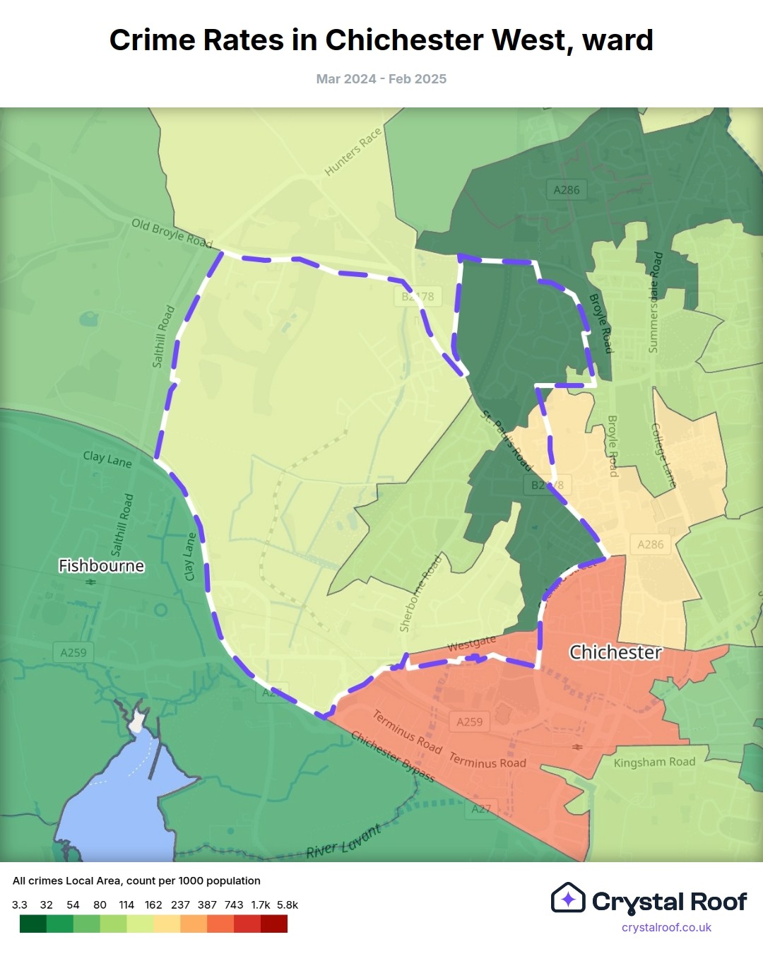 Chichester West, (ward) includes areas with the following crime ratings (see map):