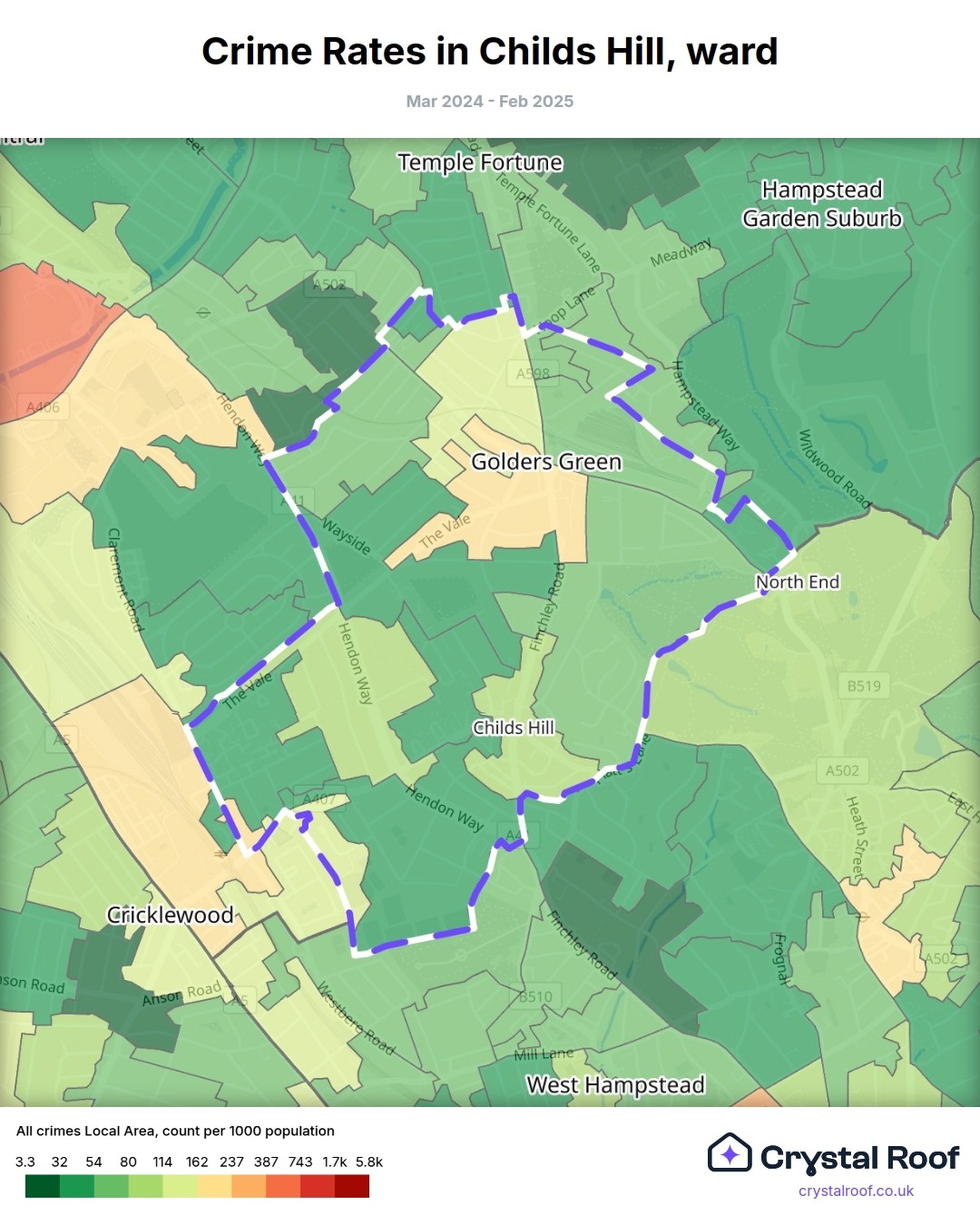 Childs Hill, (ward) includes areas with the following crime ratings (see map):