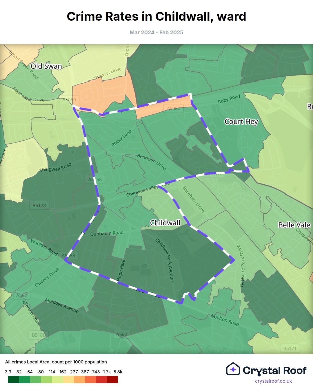 Childwall, (ward) includes areas with the following crime ratings (see map):