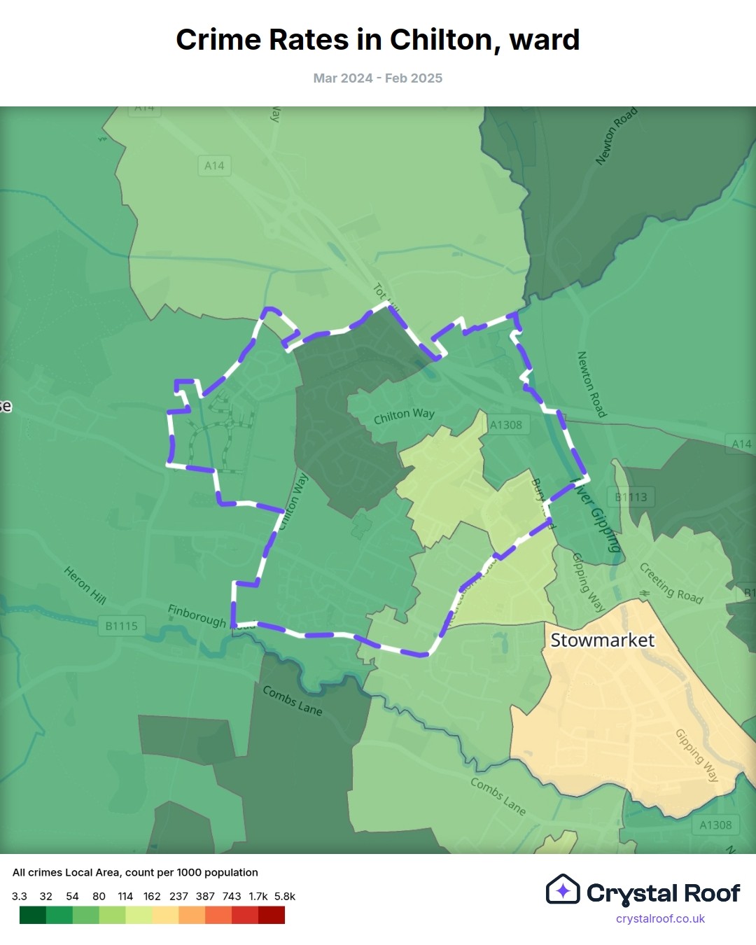 Chilton (ward) is located within Mid Suffolk (borough). Annual total crime rate in Mid Suffolk (borough) is 42.4 crimes per thousand resident population, which can be rated as 1 out of 10 or low crime level compared to other local authority districts in England and Wales.