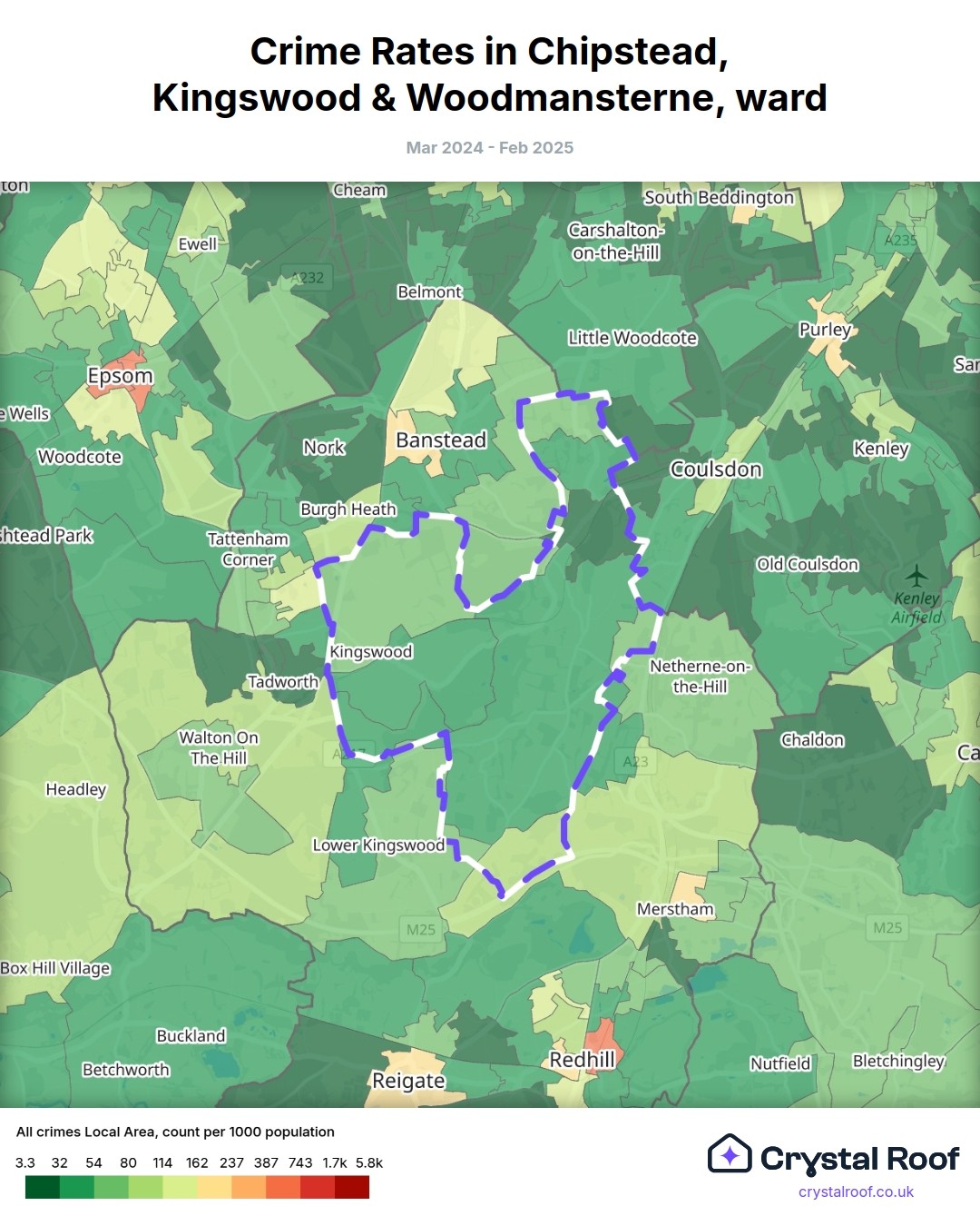 Chipstead, Kingswood & Woodmansterne, (ward) includes areas with the following crime ratings (see map):