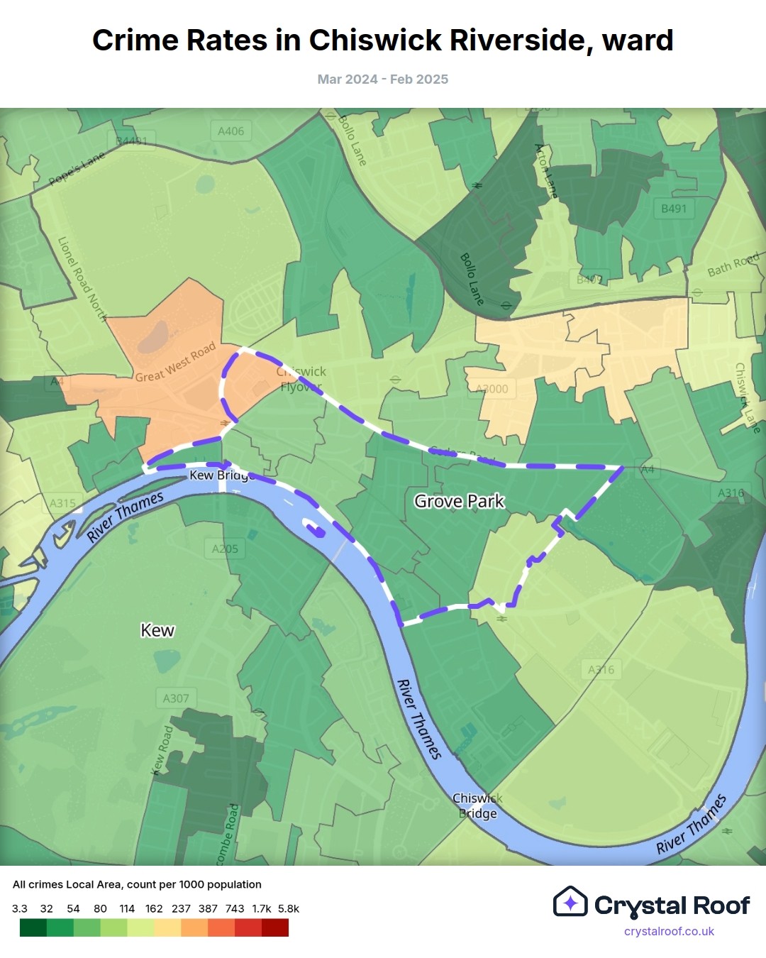 Chiswick Riverside, (ward) includes areas with the following crime ratings (see map):