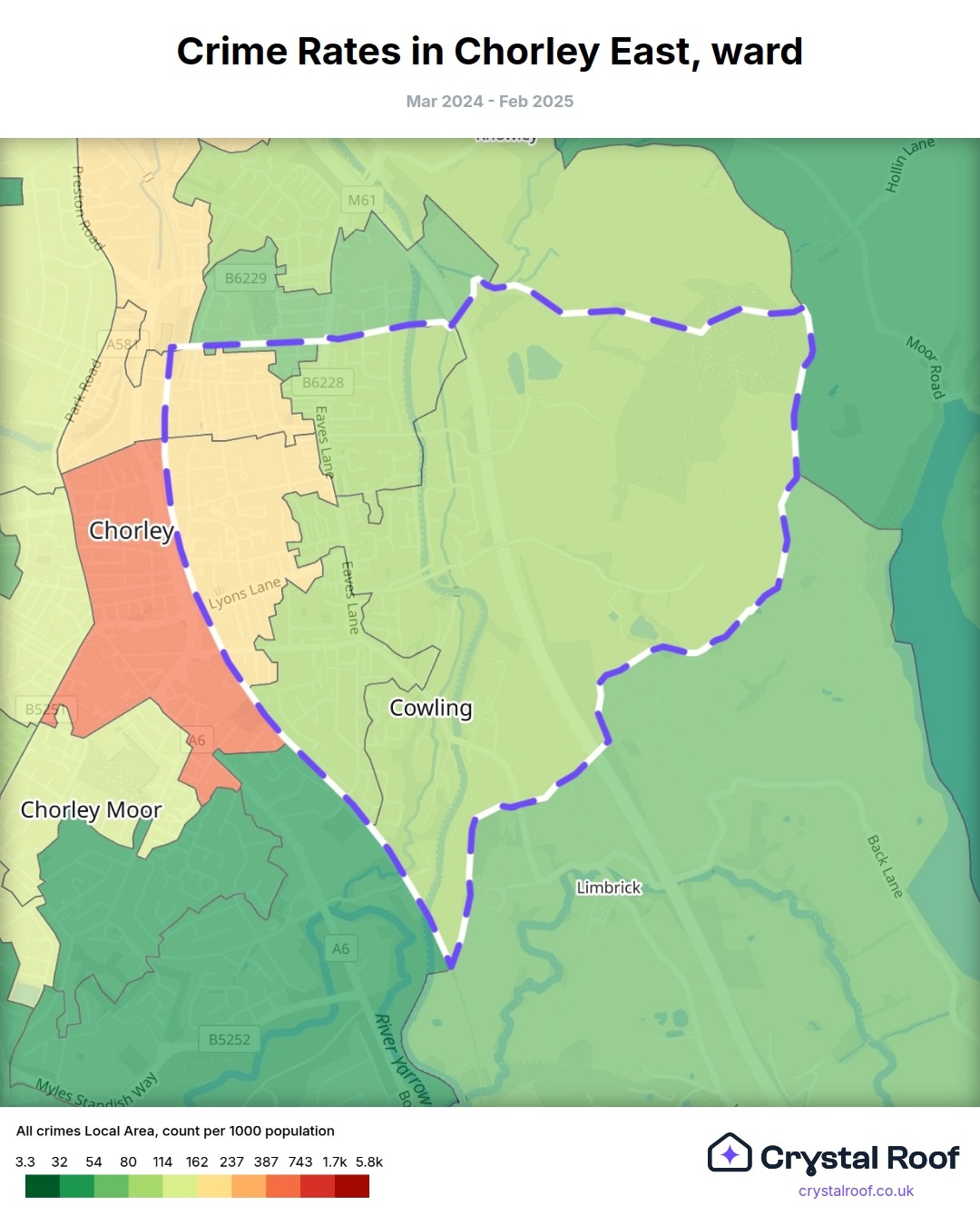 Chorley East, (ward) includes areas with the following crime ratings (see map):