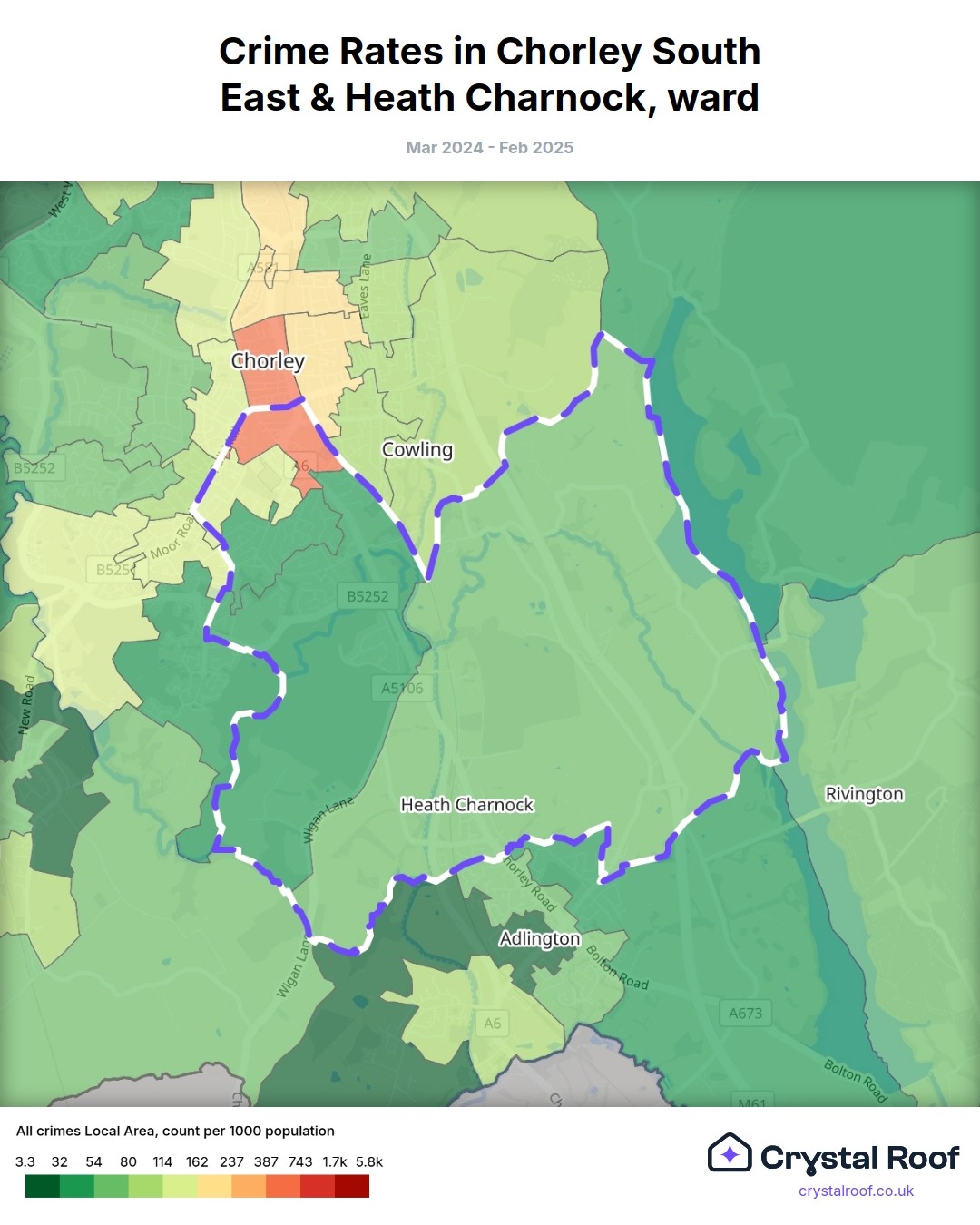 Chorley South East & Heath Charnock, (ward) includes areas with the following crime ratings (see map):