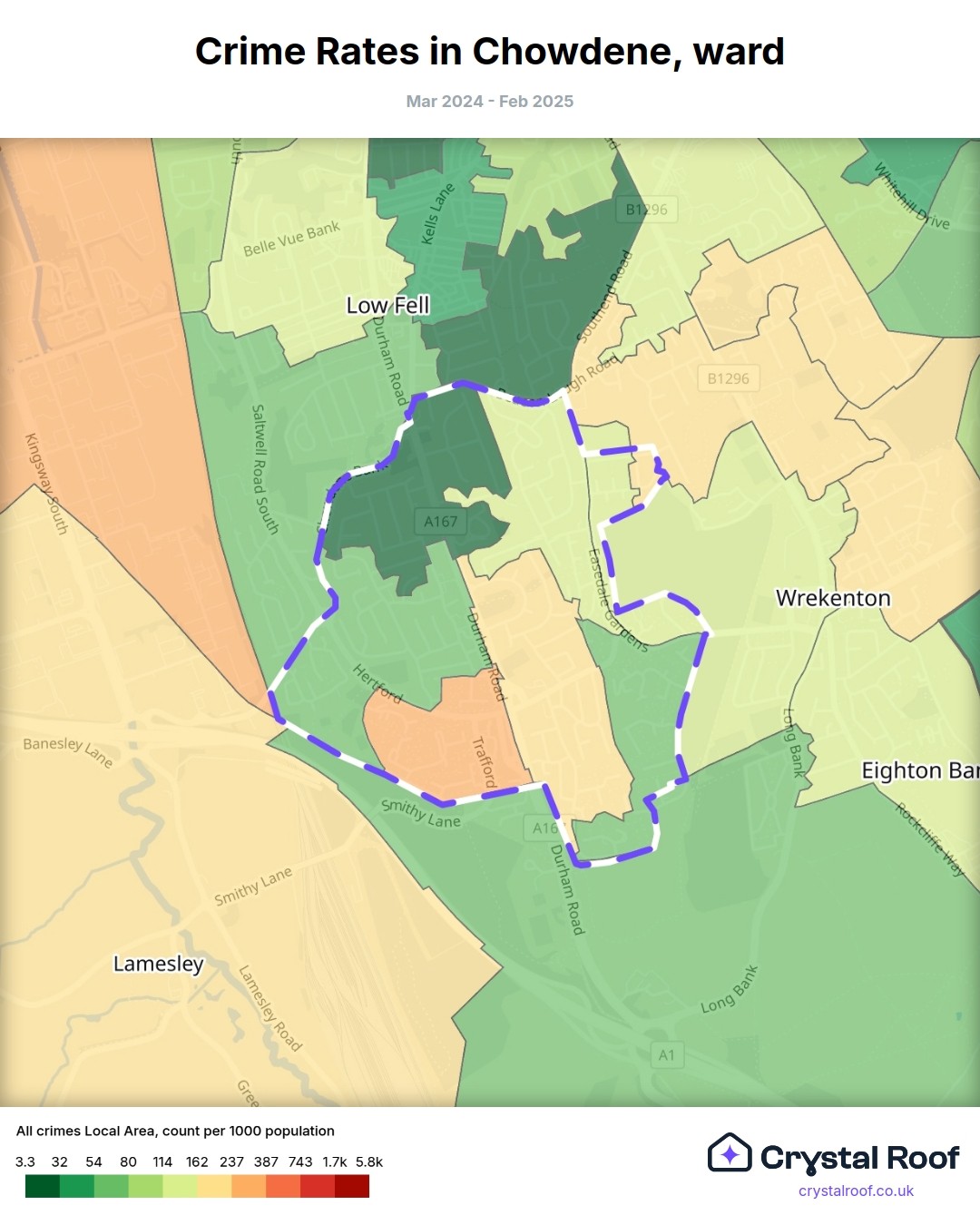 The figures in grey indicate the relative ratings of Chowdene (ward) for a specific crime type compared to other wards in England and Wales.