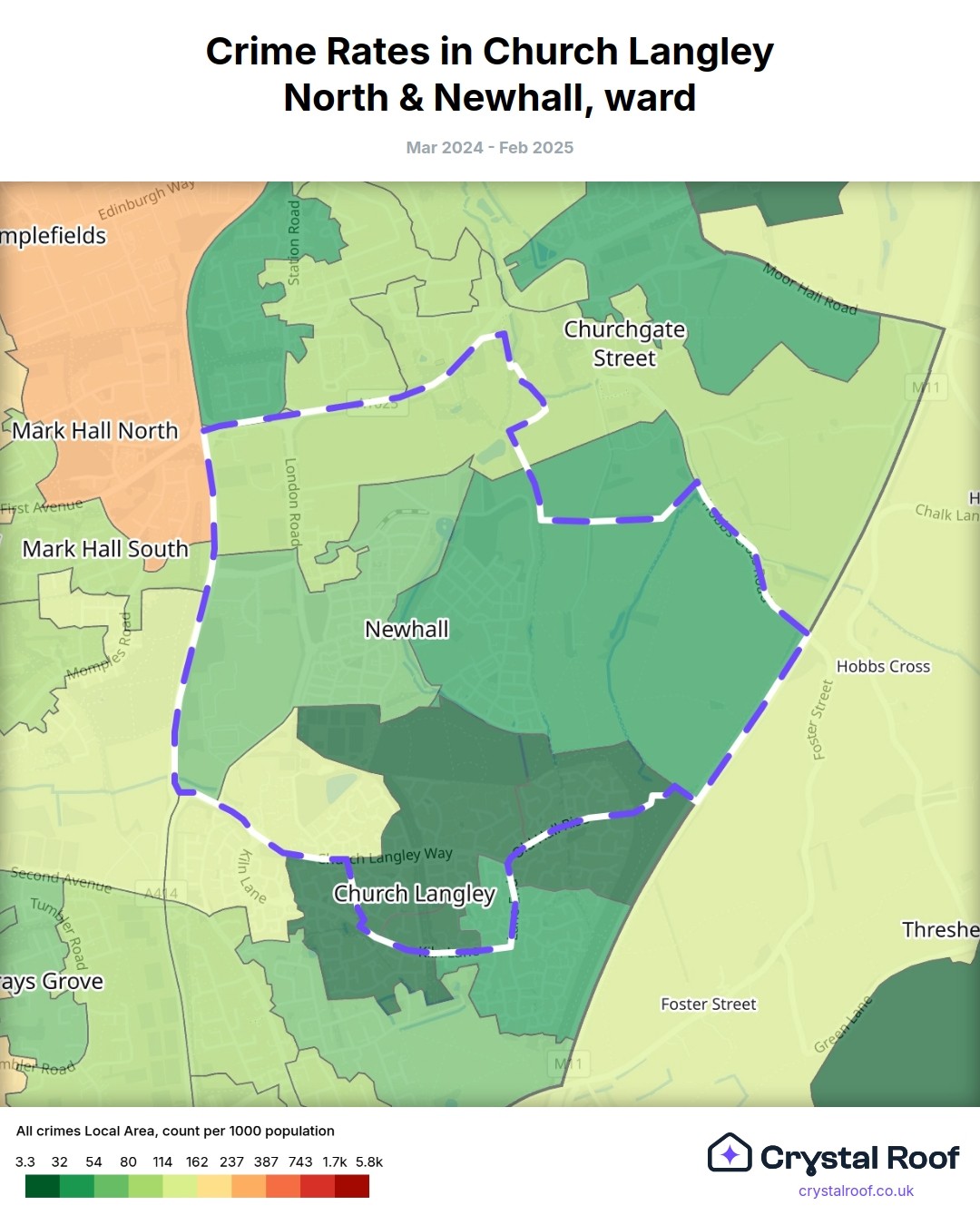 The figures in grey indicate the relative ratings of Church Langley North & Newhall (ward) for a specific crime type compared to other wards in England and Wales.