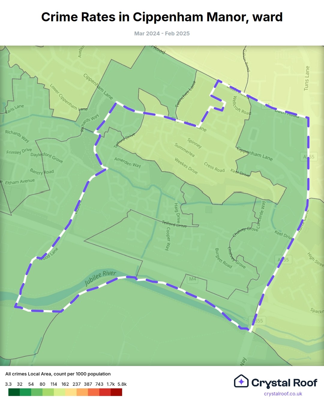 The figures in grey indicate the relative ratings of Cippenham Manor (ward) for a specific crime type compared to other wards in England and Wales.