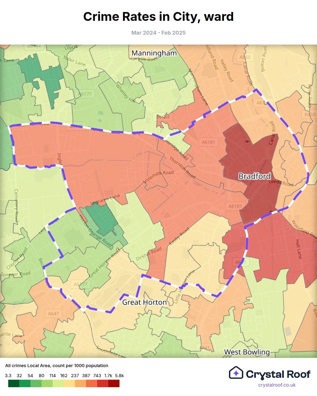 City (ward) is located within Bradford (borough). Annual total crime rate in Bradford (borough) is 139 crimes per thousand resident population, which can be rated as 7 out of 10 or high crime level compared to other local authority districts in England and Wales.