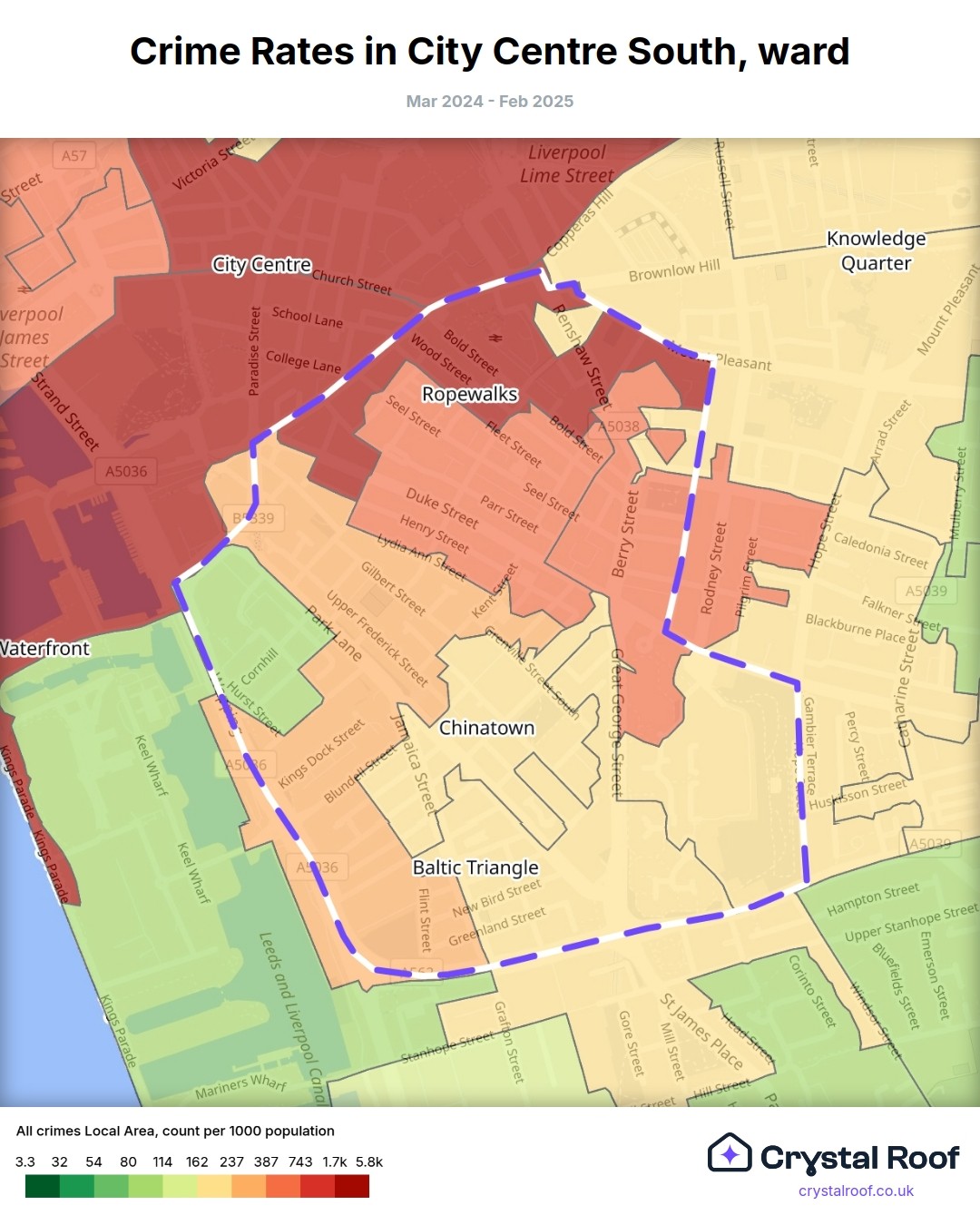 City Centre South (ward) is located within Liverpool (borough). Annual total crime rate in Liverpool (borough) is 141 crimes per thousand resident population, which can be rated as 7 out of 10 or high crime level compared to other local authority districts in England and Wales.