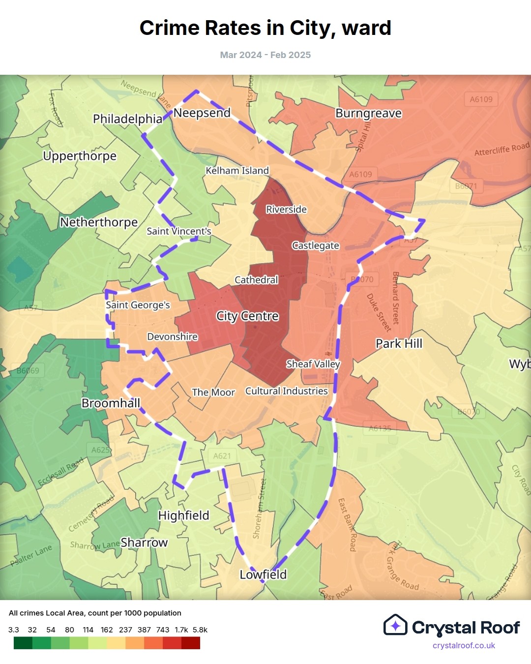 City (ward) is located within Sheffield (borough). Annual total crime rate in Sheffield (borough) is 119 crimes per thousand resident population, which can be rated as 6 out of 10 or medium crime level compared to other local authority districts in England and Wales.