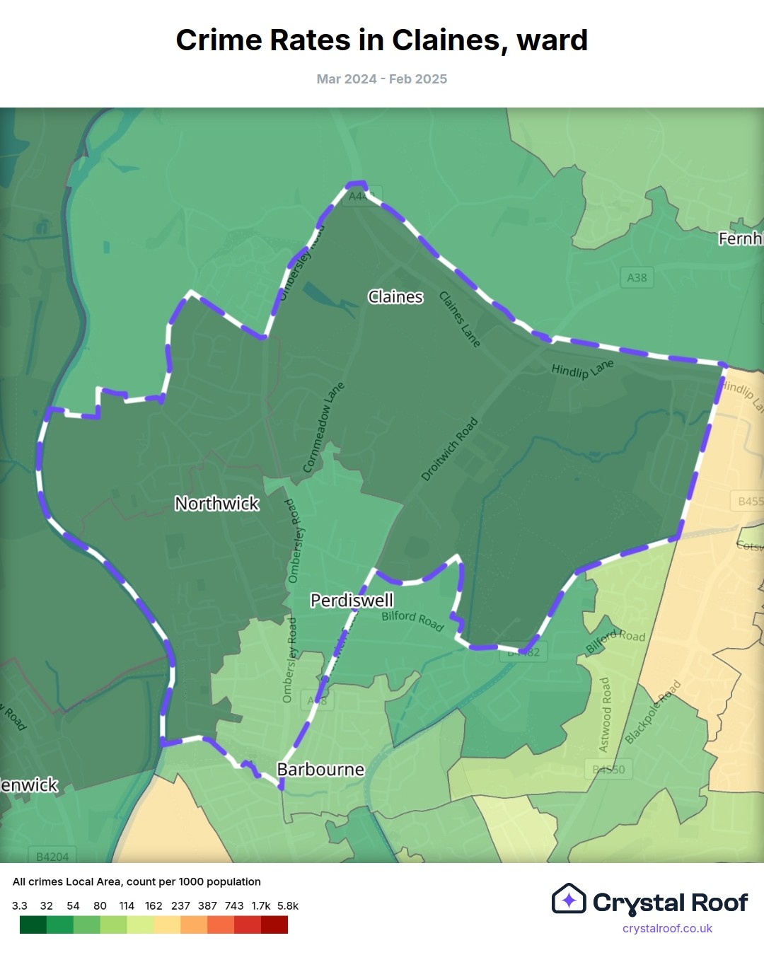 Claines, (ward) includes areas with the following crime ratings (see map):