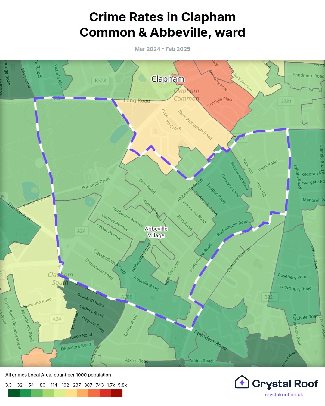 Clapham Common & Abbeville, (ward) includes areas with the following crime ratings (see map):