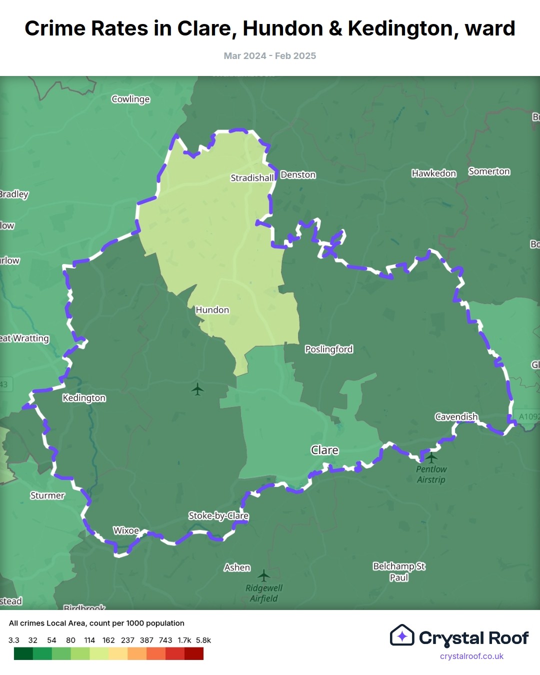 Clare, Hundon & Kedington, (ward) includes areas with the following crime ratings (see map):