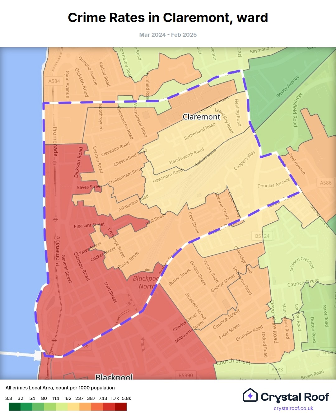 Claremont (ward) is located within Blackpool (borough). Annual total crime rate in Blackpool (borough) is 216 crimes per thousand resident population, which can be rated as 8 out of 10 or high crime level compared to other local authority districts in England and Wales.