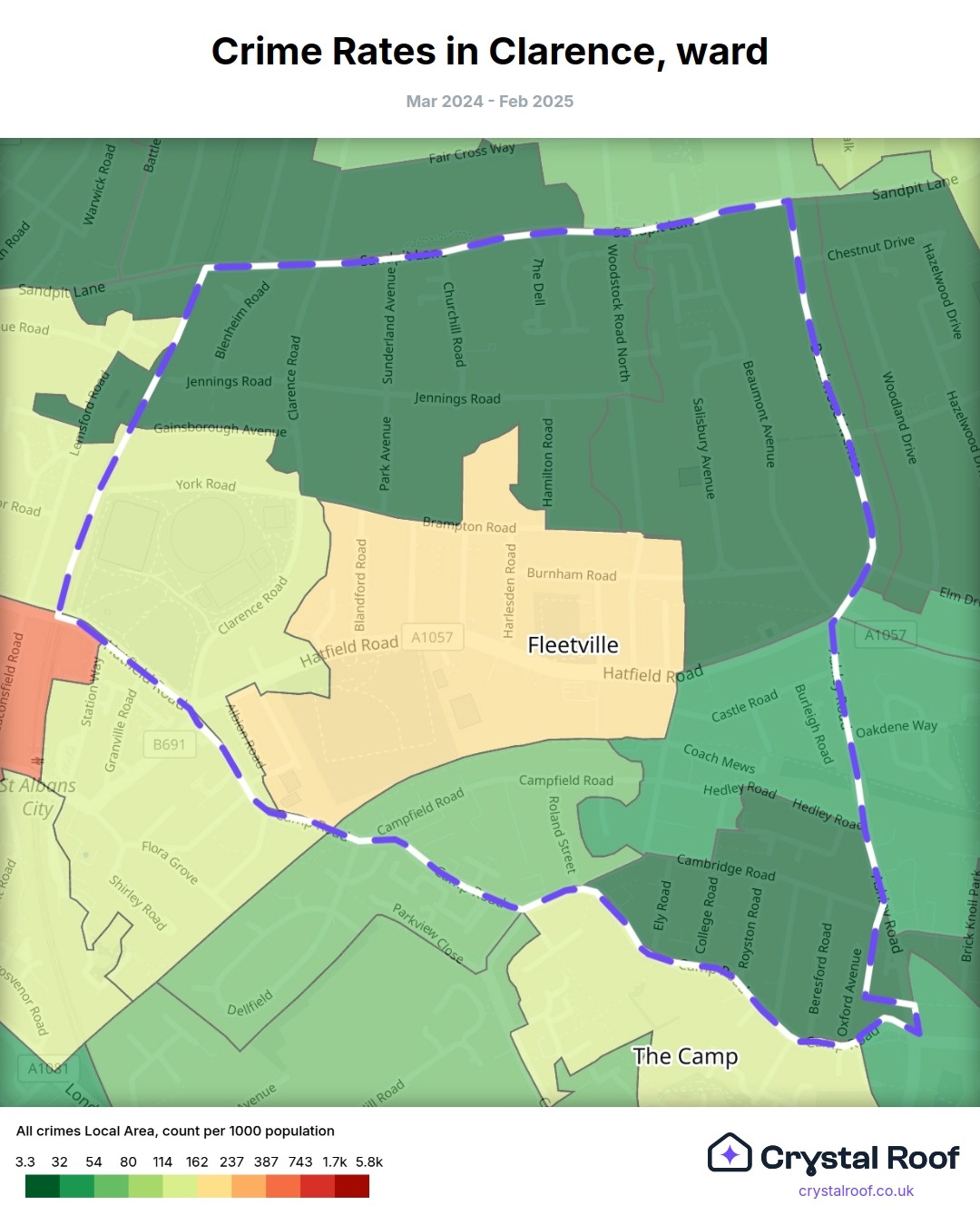 Clarence (ward) is located within St Albans (borough). Annual total crime rate in St Albans (borough) is 81.1 crimes per thousand resident population, which can be rated as 3 out of 10 or low crime level compared to other local authority districts in England and Wales.
