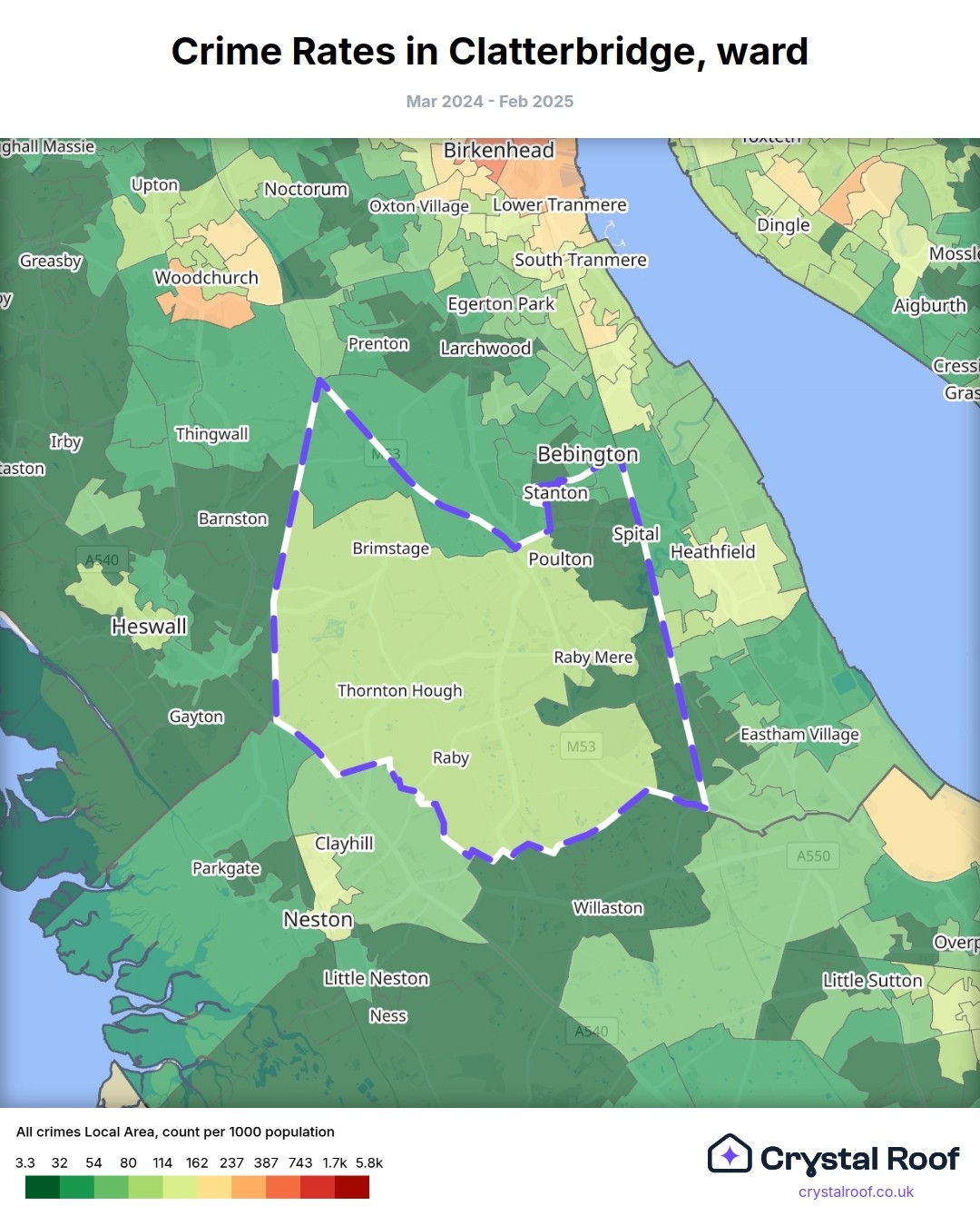 Clatterbridge, (ward) includes areas with the following crime ratings (see map):