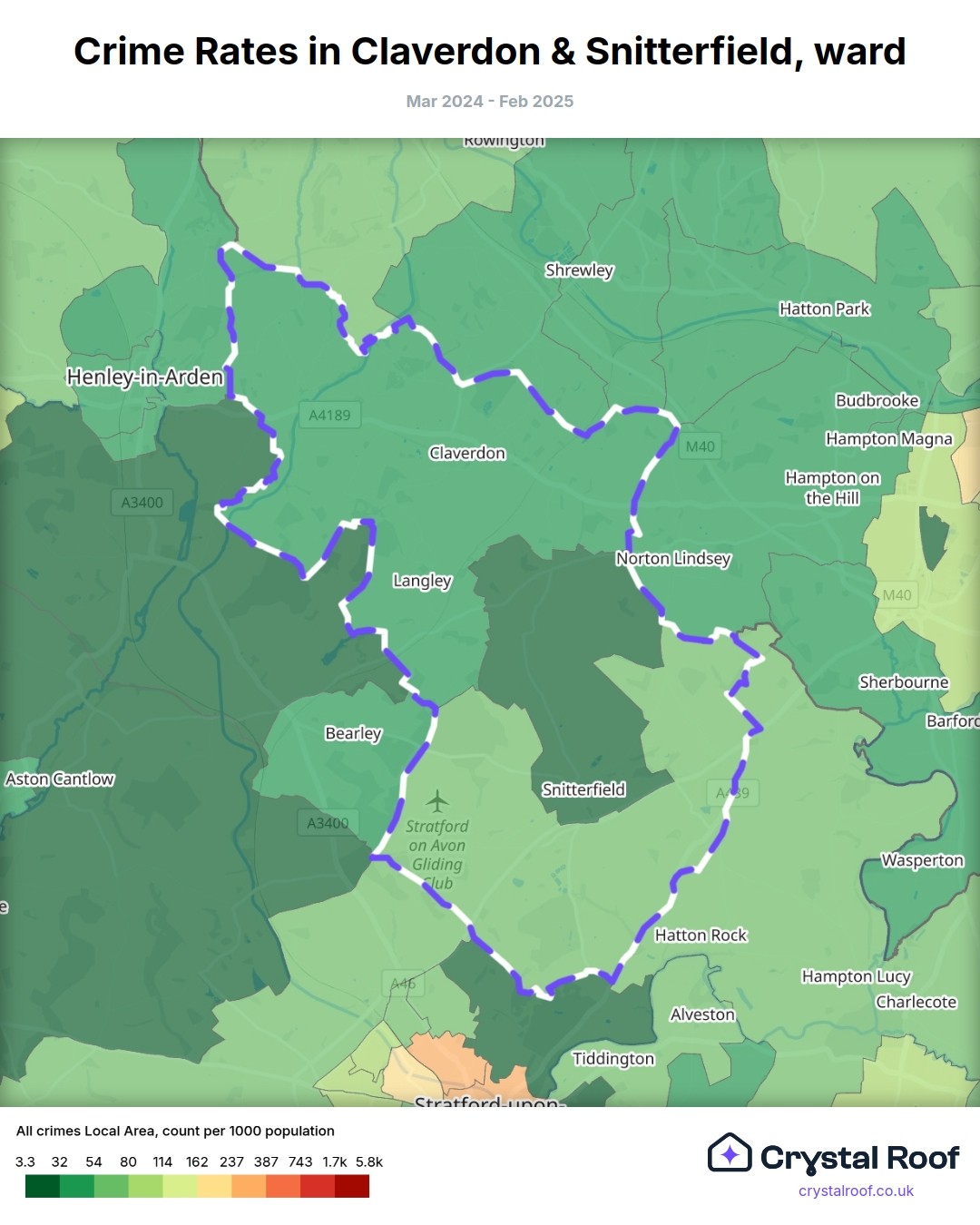 Claverdon & Snitterfield, (ward) includes areas with the following crime ratings (see map):