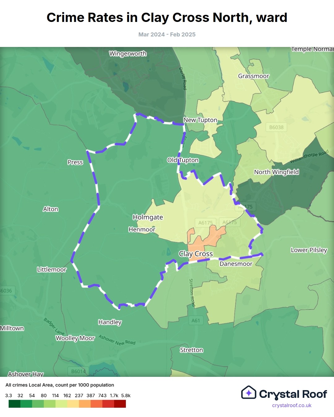 Clay Cross North, (ward) includes areas with the following crime ratings (see map):