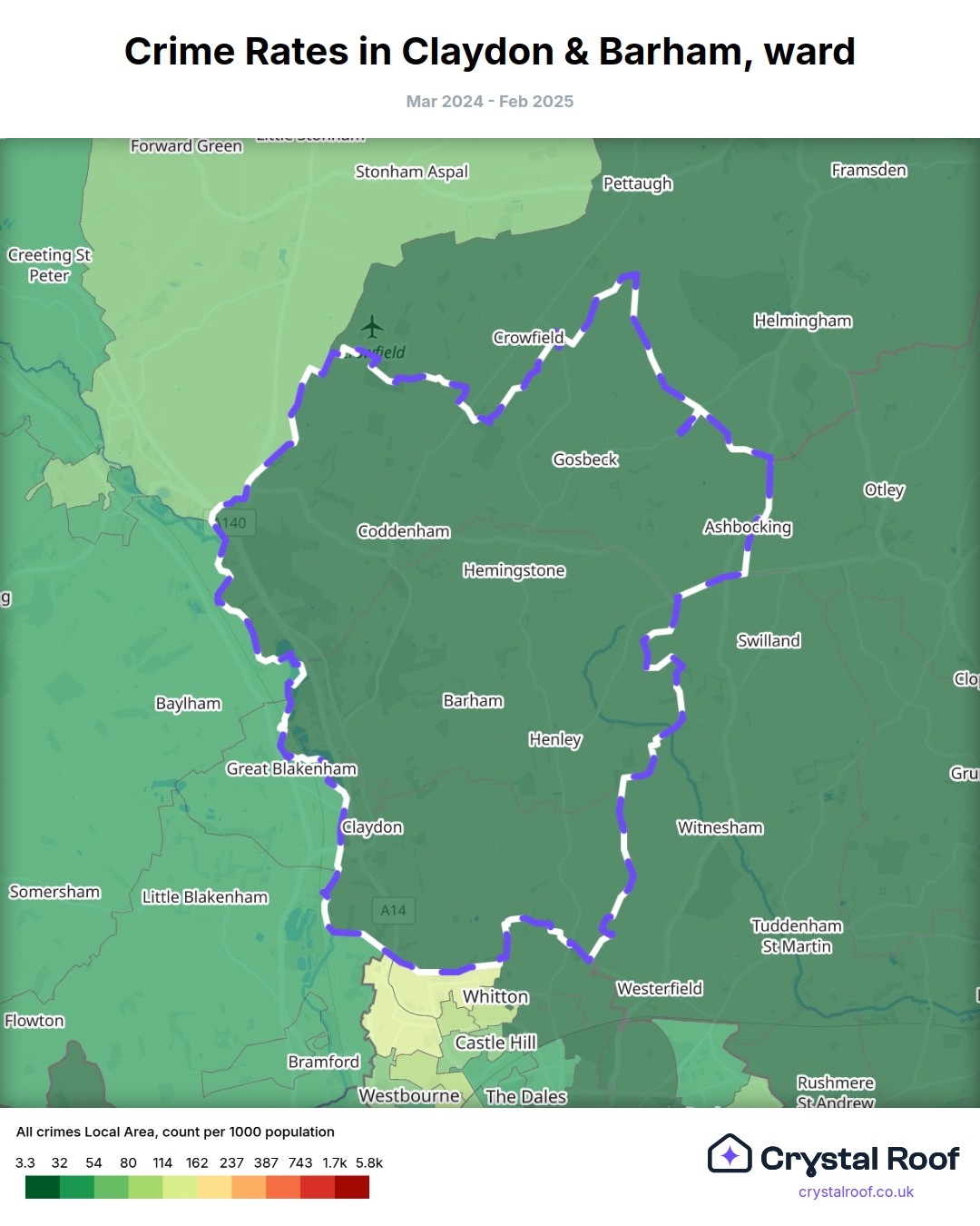 Claydon & Barham, (ward) includes areas with the following crime ratings (see map):