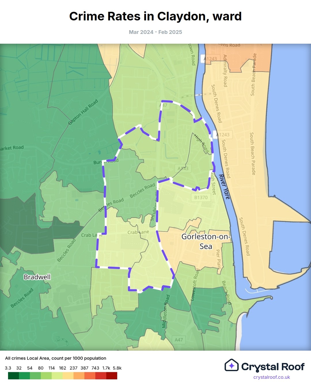 Claydon (ward) is located within Great Yarmouth (borough). Annual total crime rate in Great Yarmouth (borough) is 114 crimes per thousand resident population, which can be rated as 5 out of 10 or medium crime level compared to other local authority districts in England and Wales.