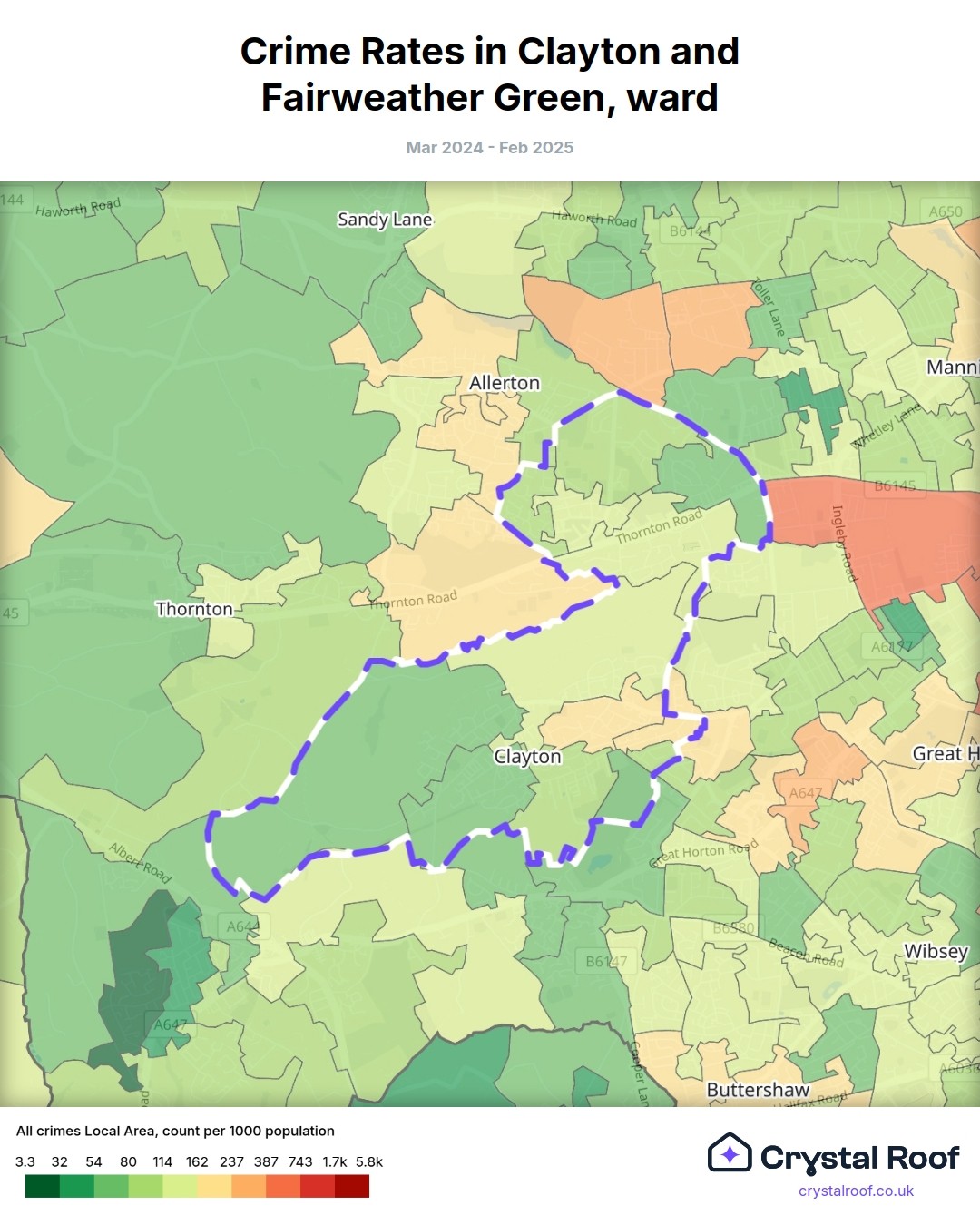 Clayton and Fairweather Green, (ward) includes areas with the following crime ratings (see map):