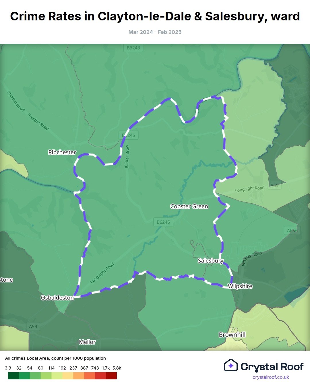 Clayton-le-Dale & Salesbury, (ward) includes areas with the following crime ratings (see map):