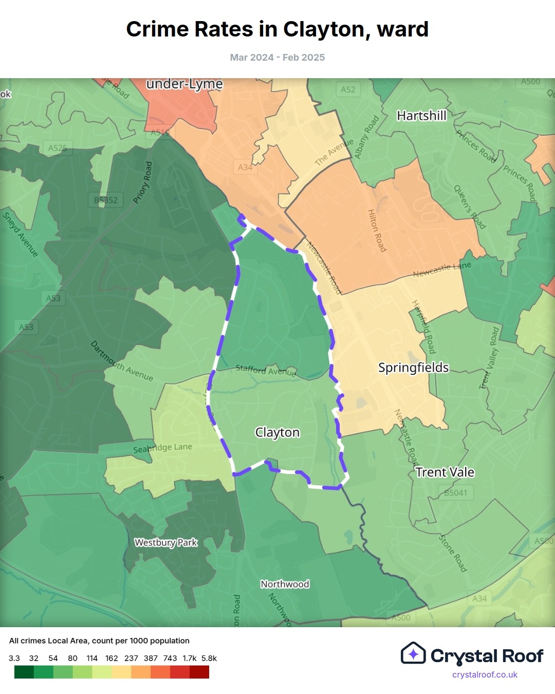 Clayton (ward) is located within Newcastle-under-Lyme (borough). Annual total crime rate in Newcastle-under-Lyme (borough) is 85.1 crimes per thousand resident population, which can be rated as 3 out of 10 or low crime level compared to other local authority districts in England and Wales.